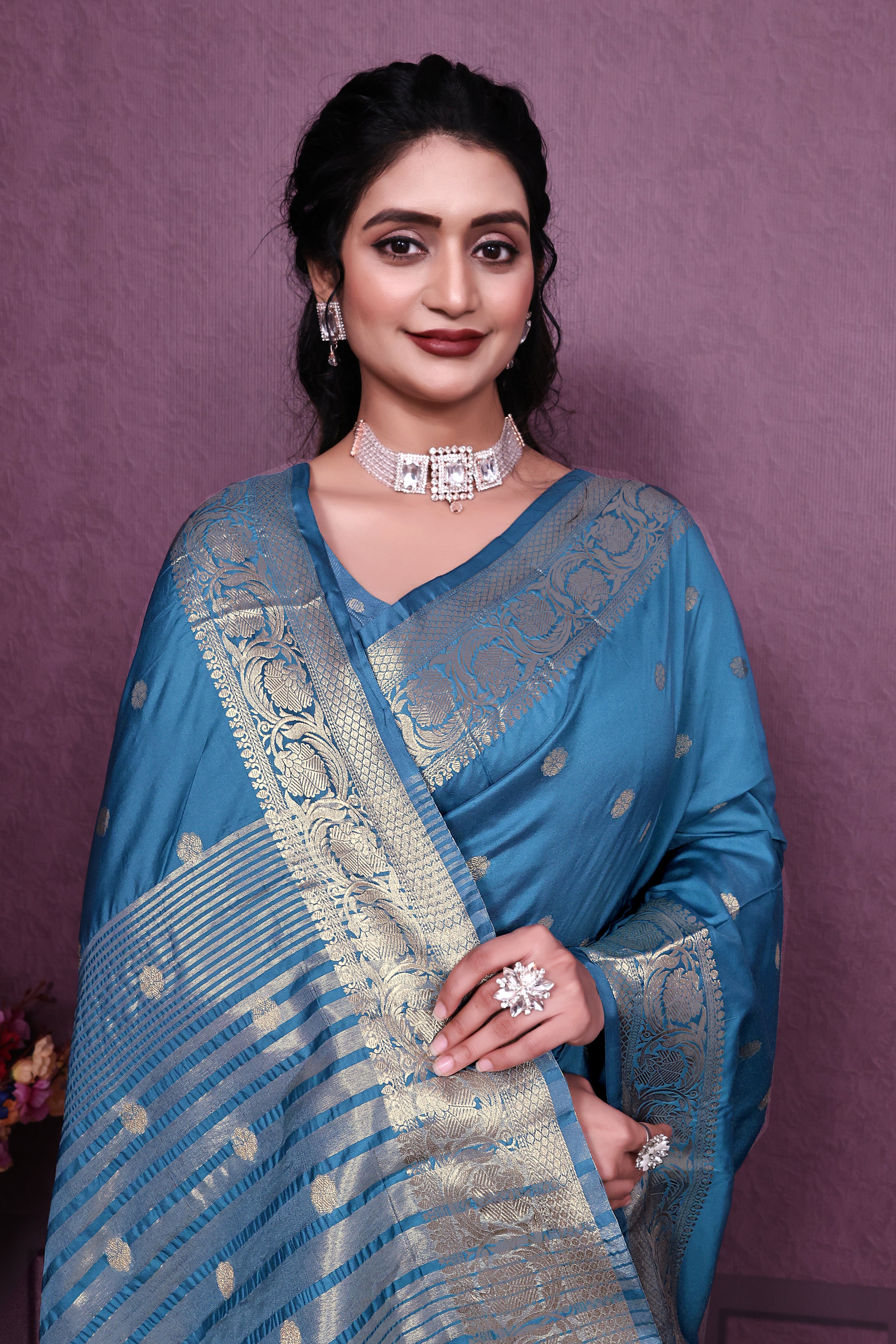 Lemon Yellow & Dark Sky Blue Stylist Designer Lichi Silk Saree