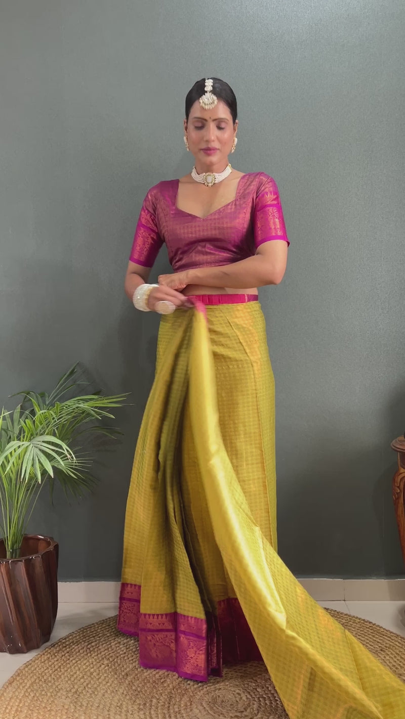 Ethnic Motifs Woven Design Zari Cheks Kanjeevaram Silk Saree Just Wear 1.Min